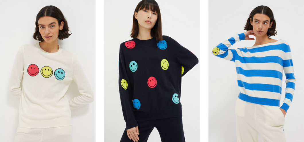 Expect a vibrant edit of wool-cashmere and pure cotton jumpers as well as jersey separates such as hoodies and track pants. The colour palette is decidedly feel-good too, with neon-bright pops of pink, yellow and blue mixed with classic navy, olive, and cream. The Smiley icon is realised in intricate intarsia and hand embroidery, accompanied by thought-provoking slogans that further spread joy and happiness.