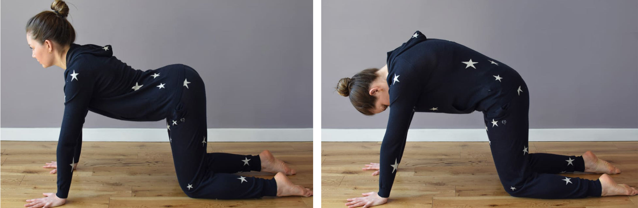 How to: Begin in all fours, with your shoulders stacked over wrists and hips over knees. On an inhale, dip your stomach toward the ground, broaden your collarbones, let the sit bones spread. Press into the hands, shins and tops of the feet. Lift the chin a little, gaze beyond the short edge of your mat.